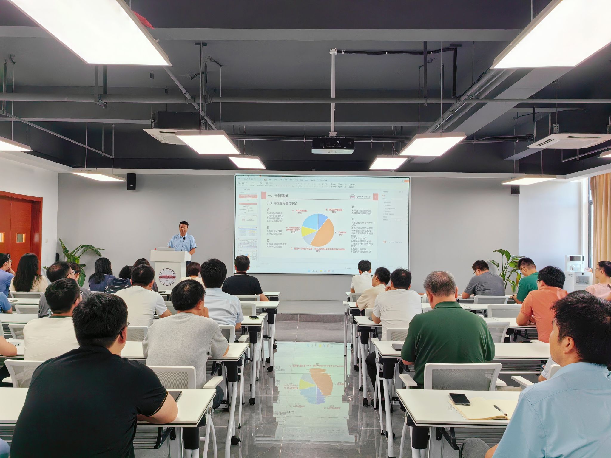 院长洪日昌首先介绍了6月份以来新入职的8位老师,并代表学院对新进教师表示热烈的欢迎。接着,洪日昌对上半年学院在教学、科研、学生培养等方面取得的成果进行了通报,他表示,成绩的背后凝结着每一位师生的汗水与智慧,希望全体教职工继续保持积极向上的精神风貌,不断追求卓越。随后,他重点解读了“计算机科学与技术”一流学科培育计划学科建设情况,对标同类高校学科情况,深入剖析了学院在师资队伍、人才培养、科研平台和标志性成果等方面存在的短板和不足。下一步,学院将面向计算机学科世界发展前沿凝练四大主攻方向,在高层次人才引育、科研与社会服务、国际交流与合作等方面继续发力,进一步推动学科水平再上新台阶。